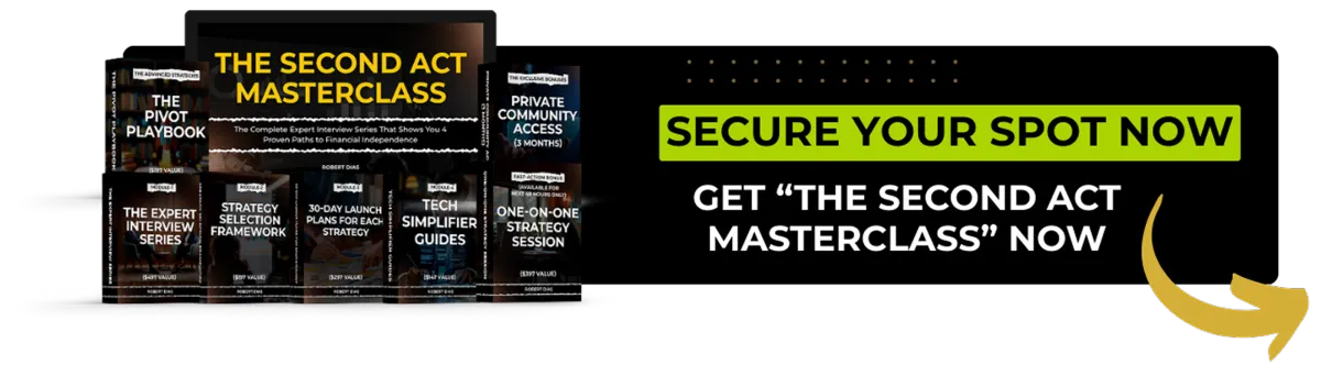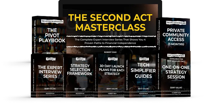 The Second Act Masterclass - Complete interviews with 4 successful entrepreneurs showing their exact business models that work for mid-career professionals.